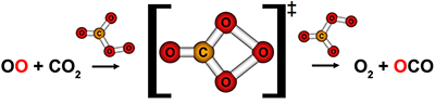 - O(3P) + CO2 collisions near 100 kcal mol-1 yield oxygen isotope exchange and oxygen-atom abstraction. Both reactions probably occur through a CO3 intermediate in that energy range, but they are both short-lived relative to molecular rotation. Still, O(3P) + CO2 isotope exchange may occur as low as the stratosphere because its barrier is only ~25 kcal mol-1; O(3P) atoms with this velocity can be generated when ozone is photolyzed in the UV region. Link to JPCA article