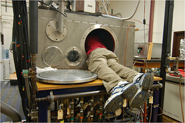 A hyperthermal (~8000 m s-1) beam of O(3P) atoms and O2 molecules is generated by high-power laser heating in the bottom right chamber and a narrow range of velocities is selected by the chopper wheel. A beam of 12C18O2 is introduced via the top right chamber. They interact in the middle (near the chopper wheel) and analyzed with a rotatable mass spectrometer, pictured on the left above. Because these molecules have to fly about 1 meter without colliding with anything else, the whole apparatus has to be at high vaccum (<10-7 Torr, or less than a billionth of an atmosphere!) So, perhaps ironically, the apparatus takes up a whole room with its pumps, forevacuum chambers, and such. Here are some more pictures of it "in action."